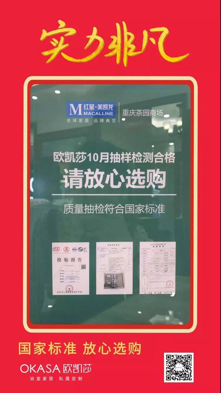 在紅星美凱龍品質抽檢活動中,歐凱莎浴室柜順利通過檢驗,品質符合并超過國家標準。歐凱莎所有木材均來自國外進口,油漆采用臺灣大寶環(huán)保油漆,對人體無危害。